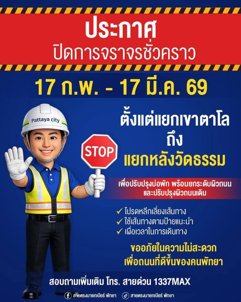 Read More📣❌แจ้งปิดการจราจรชั่วคราว 🗓 วันที่ 17 กุมภาพันธ์ – 17 มีนาคม 2569 📍 บริเวณถนนเลียบทางรถไฟ แยกเขาตาโล ถึง แยกหลังวัดธรรม