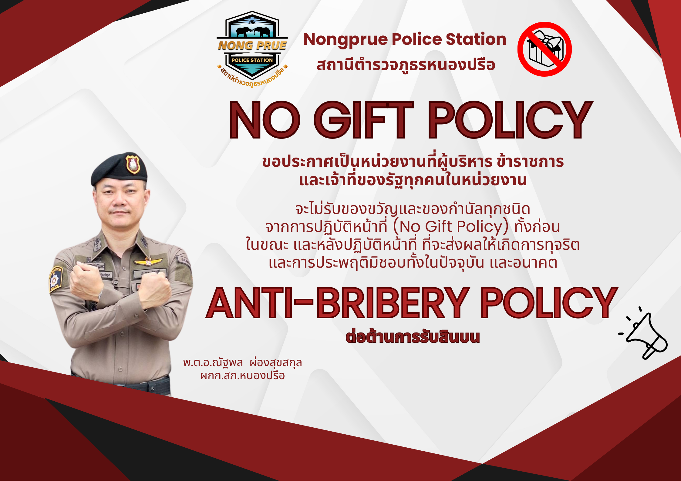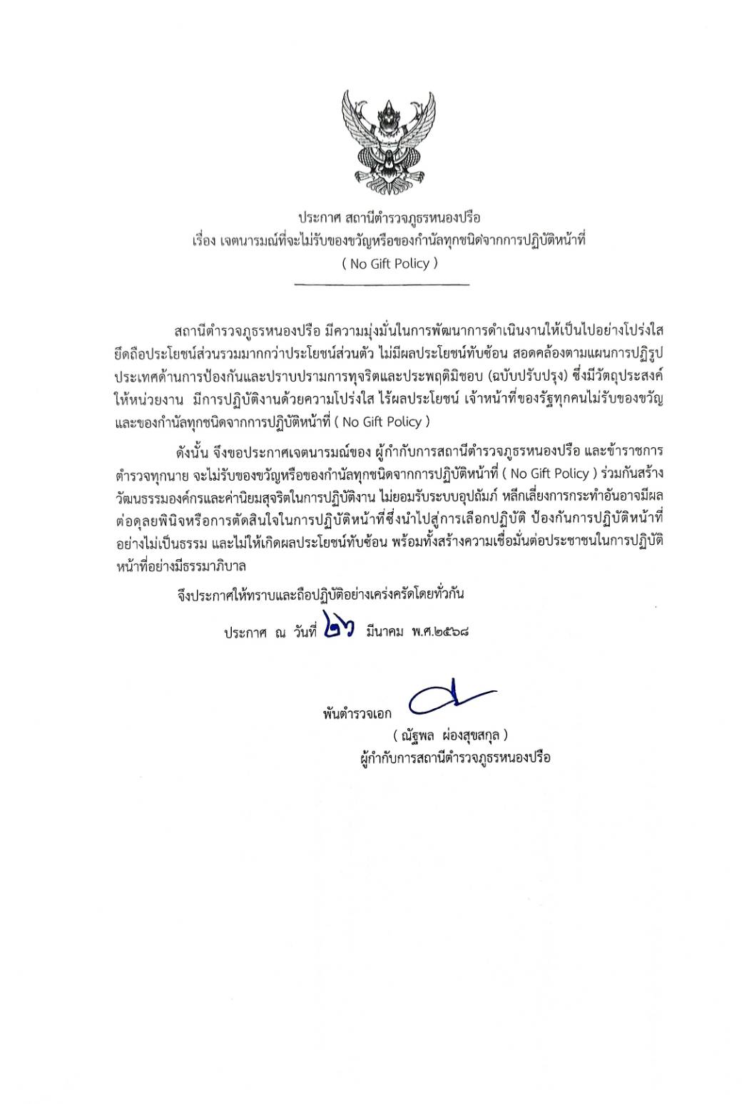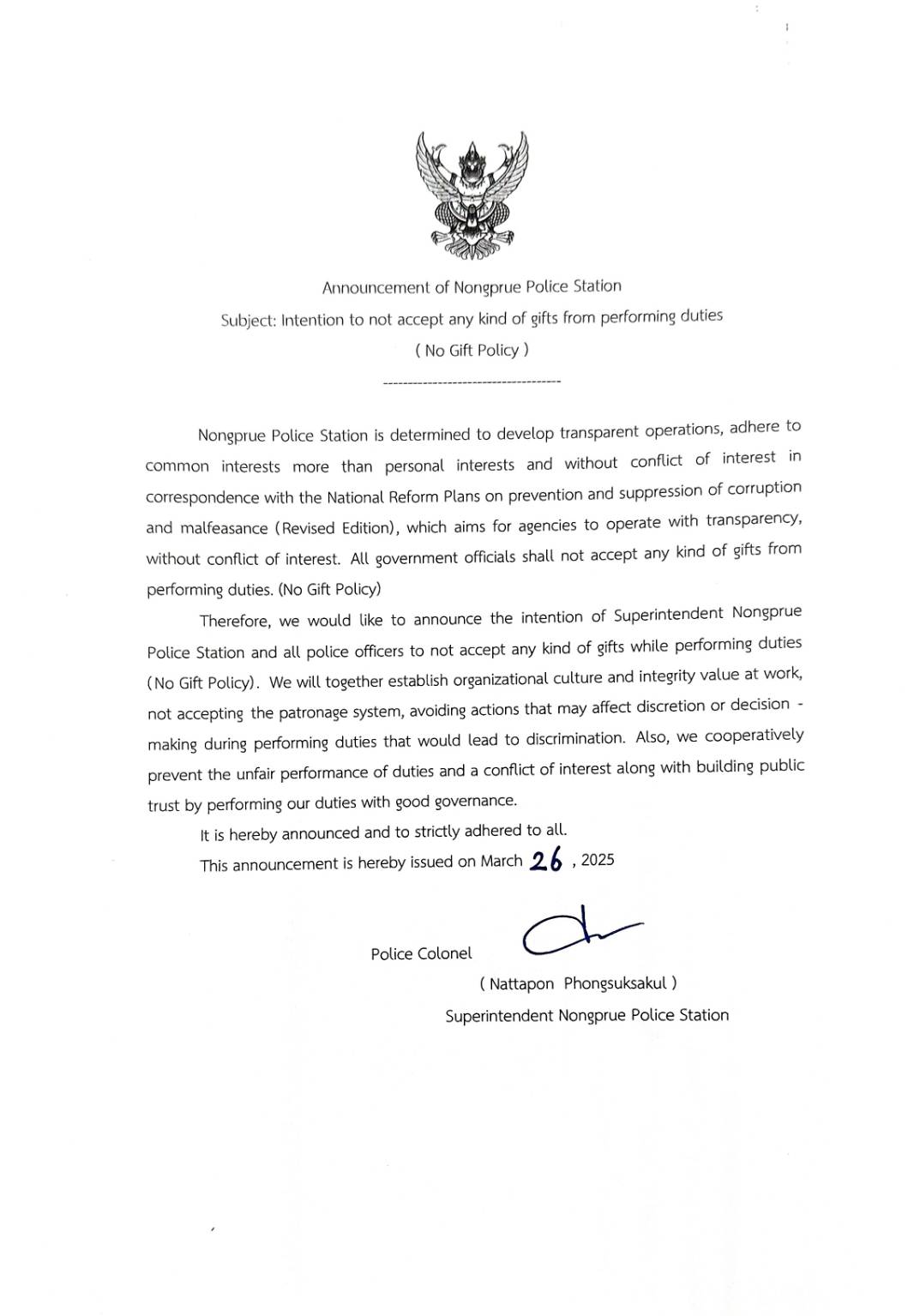 ประกาศเจนารมณ์ที่จะไม่รับของขวัญหรือของกำนัลทุกชนิดจากการปฏิบัติหน้าที่ (No Gift Policy)